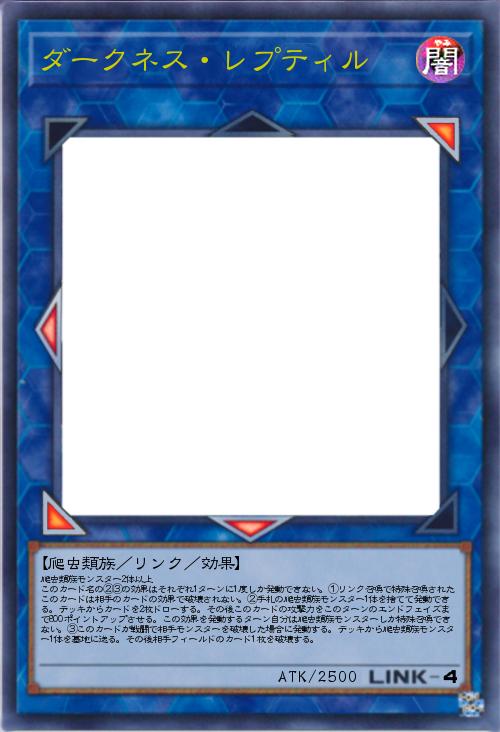 | 爬虫類族モンスター2体以上 このカード名の②③の効果はそれぞれ1ターンに1度しか発動できない。①リンク召喚で特殊召喚されたこのカードは相手のカードの効果で破壊されない。②手札の爬虫類族モンスター1体を捨てて発動できる。デッキからカードを2枚ドローする。その後このカードの攻撃力をこのターンのエンドフェイズまで800ポイントアップさせる。この効果を発動するターン自分は爬虫類族モンスターしか特殊召喚できない。③このカードが戦闘で相手モンスターを破壊した場合に発動する。デッキから爬虫類族モンスター1体を墓地に送る。その後相手フィールドのカード1枚を破壊する。 | |||