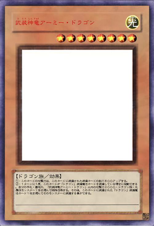 | ①:このカードの攻撃力は、このカードに装備された装備カードの数×500アップする。 ②:1ターンに1度、このカードが「ドラゴン」装備魔法カードを装備している場合に発動できる。自分の手札・墓地の、「武装神竜アーミー・ドラゴン」以外の攻撃力2000・ドラゴン族・光属性モンスター1体を選んで特殊召喚する。その後、このカードに装備された「ドラゴン」装備魔法カード1枚を選んでそのモンスターに装備する事ができる。 | |||