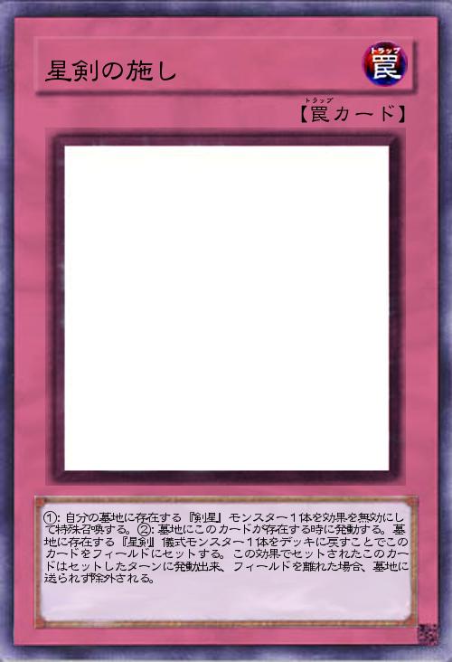 | ①:自分の墓地に存在する『剣星』モンスター1体を効果を無効にして特殊召喚する。②:墓地にこのカードが存在する時に発動する。墓地に存在する『星剣』儀式モンスター1体をデッキに戻すことでこのカードをフィールドにセットする。この効果でセットされたこのカードはセットしたターンに発動出来、フィールドを離れた場合、墓地に送られず除外される。 | |||