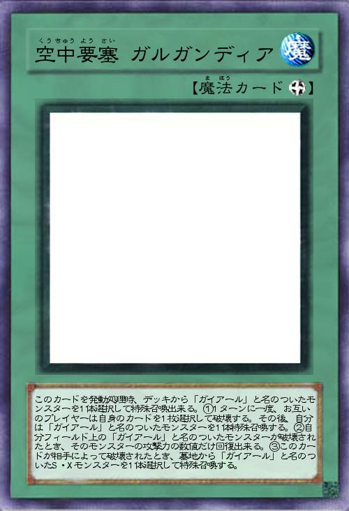 | このカードを発動処理時、デッキから「ガイアール」と名のついたモンスターを1体選択して特殊召喚出来る。①1ターンに一度、お互いのプレイヤーは自身のカードを1枚選択して破壊する。その後、自分は「ガイアール」と名のついたモンスターを1体特殊召喚する。②自分フィールド上の「ガイアール」と名のついたモンスターが破壊されたとき、そのモンスターの攻撃力の数値だけ回復出来る。③このカードが相手によって破壊されたとき、墓地から「ガイアール」と名のついたS・Xモンスターを1体選択して特殊召喚する。 | |||