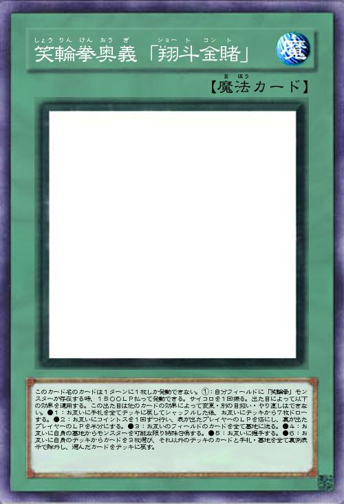 | このカード名のカードは1ターンに1枚しか発動できない。①:自分フィールドに「笑輪拳」モンスターが存在する時、1500LP払って発動できる。サイコロを1回振る。出た目によって以下の効果を適用する。この出た目は他のカードの効果によって変更・別の目扱い・やり直しはできない。●1:お互いに手札を全てデッキに戻してシャッフルした後、お互いにデッキから7枚ドローする。●2:お互いにコイントスを1回ずつ行い、表が出たプレイヤーのLPを倍にし、裏が出たプレイヤーのLPを半分にする。●3:お互いのフィールドのカードを全て墓地に送る。●4:お互いに自身の墓地からモンスターを可能な限り特殊召喚する。●5:お互いに握手する。●6:お互いに自身のデッキからカードを3枚選び、それ以外のデッキのカードと手札・墓地を全て裏側表示で除外し、選んだカードをデッキに戻す。 | |||