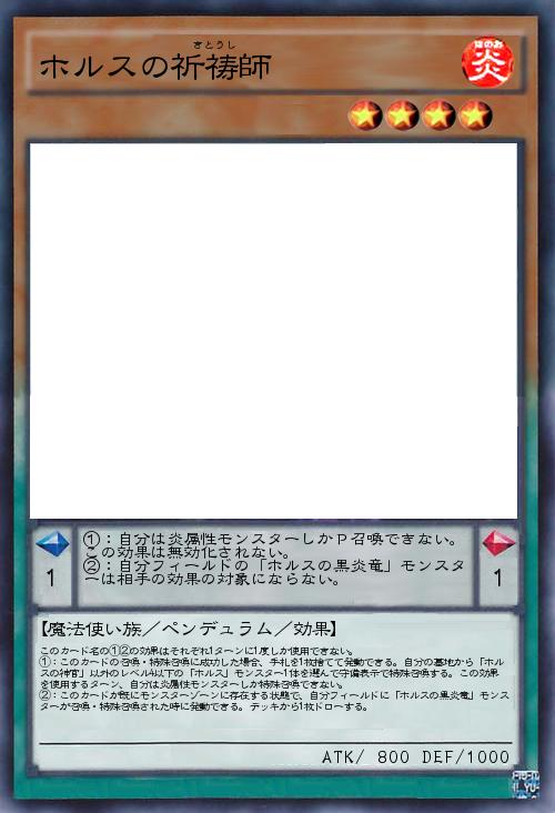 | このカード名の①②の効果はそれぞれ1ターンに1度しか使用できない。 ①:このカードの召喚・特殊召喚に成功した場合、手札を1枚捨てて発動できる。自分の墓地から「ホルスの神官」以外のレベル4以下の「ホルス」モンスター1体を選んで守備表示で特殊召喚する。この効果を使用するターン、自分は炎属性モンスターしか特殊召喚できない。 ②:このカードが既にモンスターゾーンに存在する状態で、自分フィールドに「ホルスの黒炎竜」モンスターが召喚・特殊召喚された時に発動できる。デッキから1枚ドローする。 | |||