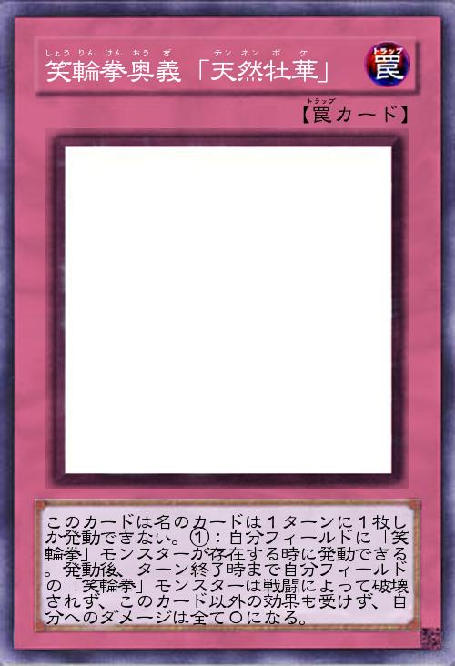 | このカードは名のカードは1ターンに1枚しか発動できない。①:自分フィールドに「笑輪拳」モンスターが存在する時に発動できる。発動後、ターン終了時まで自分フィールドの「笑輪拳」モンスターは戦闘によって破壊されず、このカード以外の効果も受けず、自分へのダメージは全て0になる。 | |||
