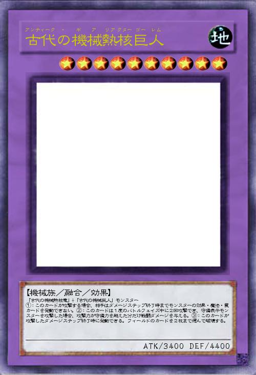 | 「古代の機械熱核竜」+「古代の機械巨人」モンスター ①:このカードが攻撃する場合、相手はダメージステップ終了時までモンスターの効果・魔法・罠カードを発動できない。②:このカードは1度のバトルフェイズ中に2回攻撃でき、守備表示モンスターを攻撃した場合、攻撃力が守備力を越えた分だけ戦闘ダメージを与える。③:このカードが攻撃したダメージステップ終了時に発動できる。フィールドのカードを2枚まで選んで破壊する。 | |||