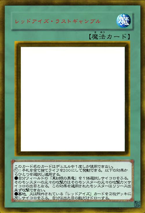 | このカード名のカードはデュエル中1度しか使用できない。 ①:手札を全て捨てライフを200にして発動できる。以下の効果からひとつを選択し適用する。 ●自分フィールドの「真紅眼の黒竜」を1体選択しサイコロをふる。そのモンスターの元々の攻撃力はそのモンスターの元々の攻撃力×サイコロの出目となる。この効果を適用されたモンスターはリリース出来ず攻撃できない。 ●墓地、又は除外されている「レッドアイズ」カードを2枚デッキに戻しサイコロをふる。自分は出た目の数だけドローする。 | |||