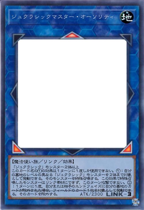 | 「ジュクラシック」モンスター2体以上 このカード名の①の効果は1ターンに1度しか使用できない。①:自分の墓地のレベルの異なる「ジュクラシック」モンスターを2体まで対象として発動できる。そのモンスターを特殊召喚する。この効果で特殊召喚したモンスターはリンク素材にできず、このターン攻撃できない。②:1ターンに1度、自分または相手のエンドフェイズに自分の墓地のカードが除外された場合、フィールドのカード1枚を対象として発動できる。そのカードを除外する。 | |||