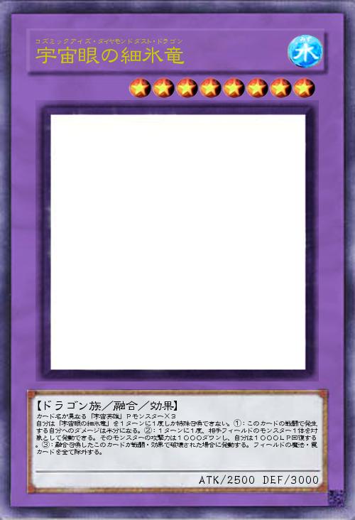 「「コズミックアイズ」の融合モンスターです。融合素材はやや重いですが、自身との戦闘で発生する自分へのダメージを半減する効果に加え、ライフゲインを行います。前回投稿した紅炎竜とは対照的に防御よりな効果を持っていますが、③の効果は魔法・罠カードを全て除外する妨害札。