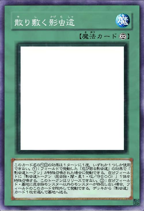 | このカード名の①②の効果は1ターンに1度、いずれか1つしか使用できない。①:フィールドで発動した「忍び寄る影虫這」の効果で「影虫這トークン」が特殊召喚された場合に発動できる。自分フィールドに「影虫這トークン(昆虫族・闇・星1・攻/守500)」1体を特殊召喚する。このトークンはリリースできない。②:自分フィールド・墓地に昆虫族モンスター以外のモンスターが存在しない場合、フィールドのこのカードを除外して発動できる。デッキから「影虫這」カード1枚を選んで墓地へ送る。 | |||