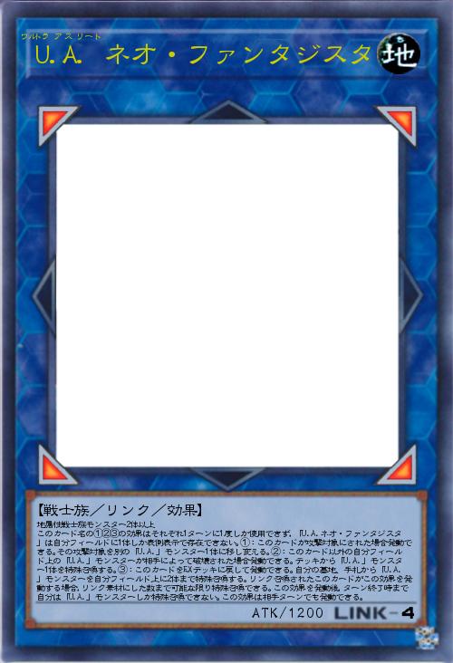 | 地属性戦士族モンスター2体以上 このカード名の①②③の効果はそれぞれ1ターンに1度しか使用できず,「U.A.ネオ・ファンタジスタ」は自分フィールドに1体しか表側表示で存在できない。①:このカードが攻撃対象にされた場合発動できる。その攻撃対象を別の「U.A.」モンスター1体に移し変える。②:このカード以外の自分フィールド上の「U.A.」モンスターが相手によって破壊された場合発動できる。デッキから「U.A.」モンスター1体を特殊召喚する。③:このカードをEXデッキに戻して発動できる。自分の墓地、手札から「U.A.」モンスターを自分フィールド上に2体まで特殊召喚する。リンク召喚されたこのカードがこの効果を発動する場合,リンク素材にした数まで可能な限り特殊召喚できる。この効果を発動後,ターン終了時まで自分は「U.A.」モンスターしか特殊召喚できない。この効果は相手ターンでも発動できる。 | |||