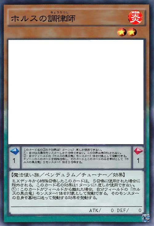 | このカード名の②のP効果は1ターンに1度しか使用できない。 ①:自分は炎属性モンスターしかP召喚できない。この効果は無効化されない。 ②:自分フィールドの「ホルスの黒炎竜」モンスター1体を対象として発動できる。Pゾーンのこのカードを特殊召喚し、そのカードとこのカードのみを素材として「ホルスの黒炎竜」Sモンスター1体をS召喚する。 | |||