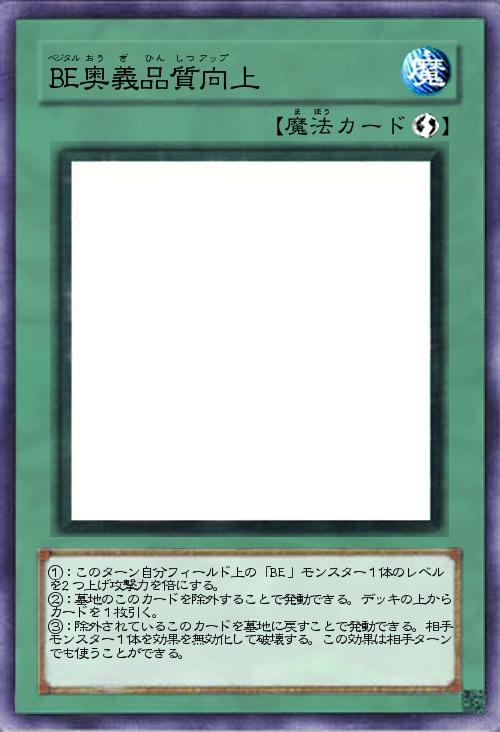| ①:このターン自分フィールド上の「BE」モンスター1体のレベルを2つ上げ攻撃力を倍にする。 ②:墓地のこのカードを除外することで発動できる。デッキの上からカードを1枚引く。 ③:除外されているこのカードを墓地に戻すことで発動できる。相手モンスター1体を効果を無効化して破壊する。この効果は相手ターンでも使うことができる。 | |||