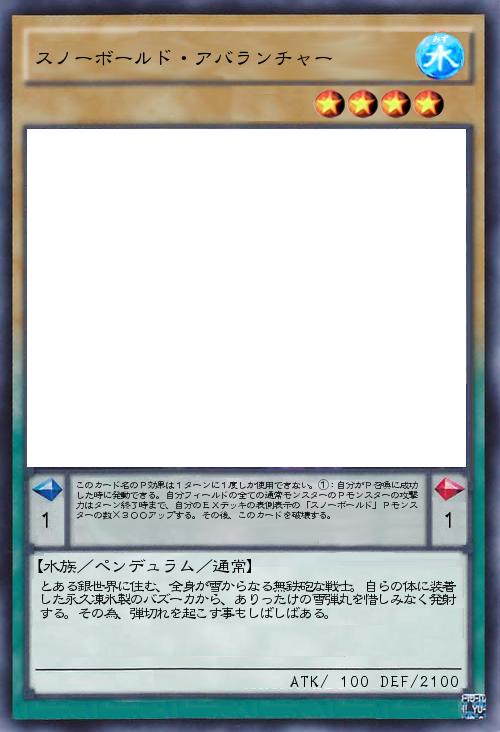 | このカード名のP効果は1ターンに1度しか使用できない。①:自分がP召喚に成功した時に発動できる。自分フィールドの全ての通常モンスターのPモンスターの攻撃力はターン終了時まで、自分のEXデッキの表側表示の「スノーボールド」Pモンスターの数×300アップする。その後、このカードを破壊する。 | |||