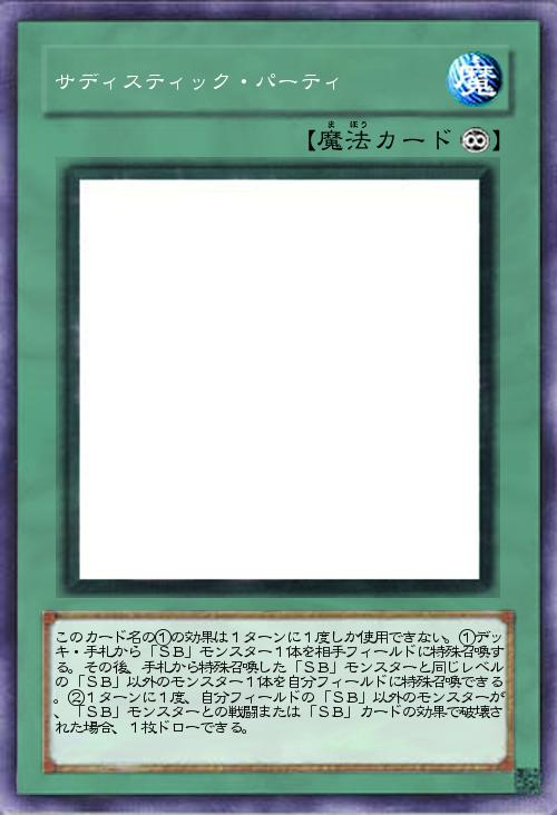 | このカード名の①の効果は1ターンに1度しか使用できない。①デッキ・手札から「SB」モンスター1体を相手フィールドに特殊召喚する。その後、手札から特殊召喚した「SB」モンスターと同じレベルの「SB」以外のモンスター1体を自分フィールドに特殊召喚できる。②1ターンに1度、自分フィールドの「SB」以外のモンスターが、「SB」モンスターとの戦闘または「SB」カードの効果で破壊された場合、1枚ドローできる。 | |||