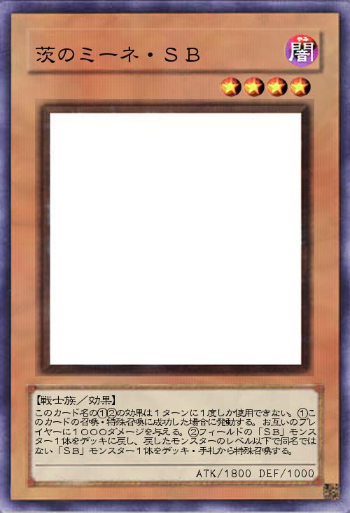 | このカード名の①②の効果は1ターンに1度しか使用できない。①このカードの召喚・特殊召喚に成功した場合に発動する。お互いのプレイヤーに1000ダメージを与える。②フィールドの「SB」モンスター1体をデッキに戻し、戻したモンスターのレベル以下で同名ではない「SB」モンスター1体をデッキ・手札から特殊召喚する。 | |||