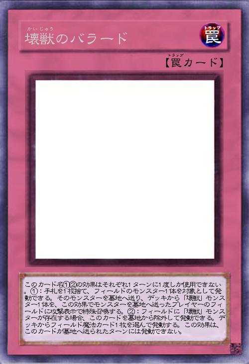 | このカード名①②の効果はそれぞれ1ターンに1度しか使用できない。①:手札を1枚捨て、フィールドのモンスター1体を対象として発動できる。そのモンスターを墓地へ送り、デッキから「壊獣」モンスター1体を、この効果でモンスターを墓地へ送ったプレイヤーのフィールドに攻撃表示で特殊召喚する。②:フィールドに「壊獣」モンスターが存在する場合、このカードを墓地から除外して発動できる。デッキからフィールド魔法カード1枚を選んで発動する。この効果は、このカードが墓地へ送られたターンには発動できない。 | |||