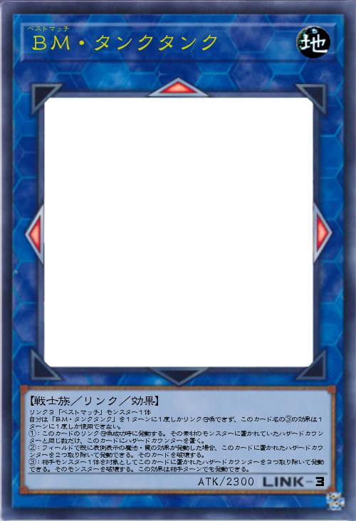 | リンク3「ベストマッチ」モンスター1体 自分は「BM・タンクタンク」を1ターンに1度しかリンク召喚できず、このカード名の③の効果は1ターンに1度しか使用できない。 ①:このカードのリンク召喚成功時に発動する。その素材のモンスターに置かれていたハザードカウンターと同じ数だけ、このカードにハザードカウンターを置く。 ②:フィールドで既に表側表示の魔法・罠の効果が発動した場合、このカードに置かれたハザードカウンターを2つ取り除いて発動できる。そのカードを破壊する。 ③:相手モンスター1体を対象としてこのカードに置かれたハザードカウンターを3つ取り除いて発動できる。そのモンスターを破壊する。この効果は相手ターンでも発動できる。 | |||