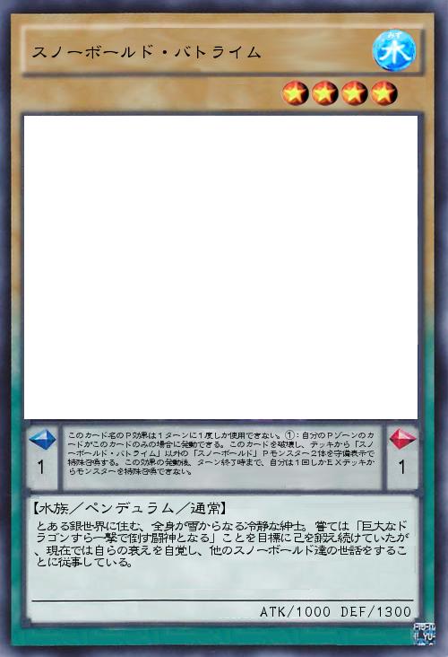 | このカード名のP効果は1ターンに1度しか使用できない。①:自分のPゾーンのカードがこのカードのみの場合に発動できる。このカードを破壊し、デッキから「スノーボールド・バトライム」以外の「スノーボールド」Pモンスター2体を守備表示で特殊召喚する。この効果の発動後、ターン終了時まで、自分は1回しかEXデッキからモンスターを特殊召喚できない。 | |||