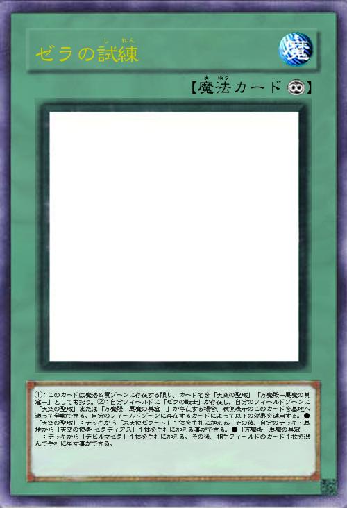 | ①:このカードは魔法&罠ゾーンに存在する限り、カード名を「天空の聖域」「万魔殿-悪魔の巣窟-」としても扱う。②:自分フィールドに「ゼラの戦士」が存在し、自分のフィールドゾーンに「天空の聖域」または「万魔殿-悪魔の巣窟-」が存在する場合、表側表示のこのカードを墓地へ送って発動できる。自分のフィールドゾーンに存在するカードによって以下の効果を適用する。●「天空の聖域」:デッキから「大天使ゼラート」1体を手札に加える。その後、自分のデッキ・墓地から「天空の使者 ゼラディアス」1体を手札に加える事ができる。●「万魔殿-悪魔の巣窟-」:デッキから「デビルマゼラ」1体を手札に加える。その後、相手フィールドのカード1枚を選んで手札に戻す事ができる。 | |||
