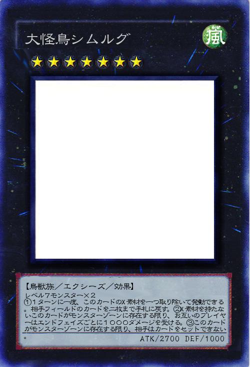 「シムルグのエクシーズモンスター。ダーク・シムルグと同様のセット封じ効果とエクシーズ素材を使用して始祖神鳥シムルグと同様のバウンス効果を発動します。エクシーズ素材がない状態だと神鳥シムルグと同様のバーンダメージを与えますが、こちらはダメージを軽減できない点で異なる感じにしてあります。」(2019-07-19 23:00)