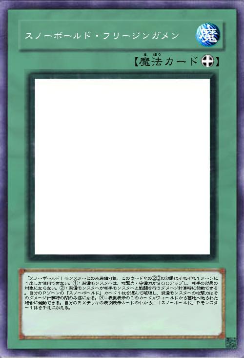 | 「スノーボールド」モンスターにのみ装備可能。このカード名の②③の効果はそれぞれ1ターンに1度しか使用できない。①:装備モンスターは、攻撃力・守備力が300アップし、相手の効果の対象にならない。②:装備モンスターが相手モンスターと戦闘を行うダメージ計算時に発動できる。自分のPゾーンの「スノーボールド」カード1枚を選んで破壊し、装備モンスターの攻撃力はそのダメージ計算時の間のみ倍になる。③:表側表示のこのカードがフィールドから墓地へ送られた場合に発動できる。自分のEXデッキの表側表示カードの中から、「スノーボールド」Pモンスター1体を手札に加える。 | |||