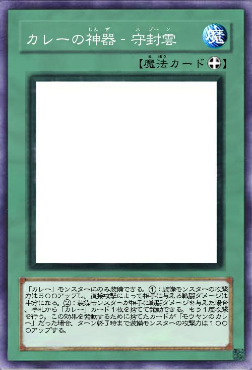 | 「カレー」モンスターにのみ装備できる。①:装備モンスターの攻撃力は500アップし、直接攻撃によって相手に与える戦闘ダメージは半分になる。②:装備モンスターが相手に戦闘ダメージを与えた場合、手札から「カレー」カード1枚を捨てて発動できる。もう1度攻撃を行う。この効果を発動するために捨てたカードが「モウヤンのカレー」だった場合、ターン終了時まで装備モンスターの攻撃力は1000アップする。 | |||
