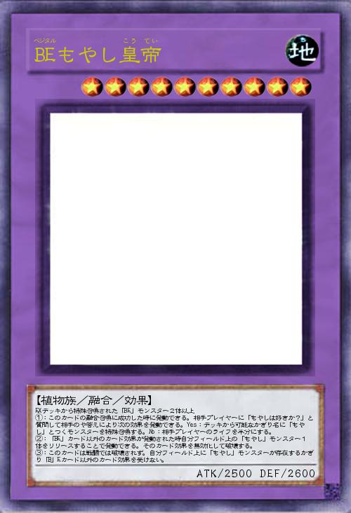 | EXデッキから特殊召喚された「BE」モンスター2体以上 ①:このカードの融合召喚に成功した時に発動できる。相手プレイヤーに「もやしは好きか?」と質問して相手のや答えにより次の効果を発動できる。Yes:デッキから可能なかぎり名に「もやし」とつくモンスターを特殊召喚する。No:相手プレイヤーのライフを半分にする。 ②:「BE」カード以外のカード効果が発動された時自分フィールド上の「もやし」モンスター1体をリリースすることで発動できる。そのカード効果を無効化して破壊する。 ③:このカードは戦闘では破壊されず。自分フィールド上に「もやし」モンスターが存在するかぎり「B」Eカード以外のカード効果を受けない。 | |||
