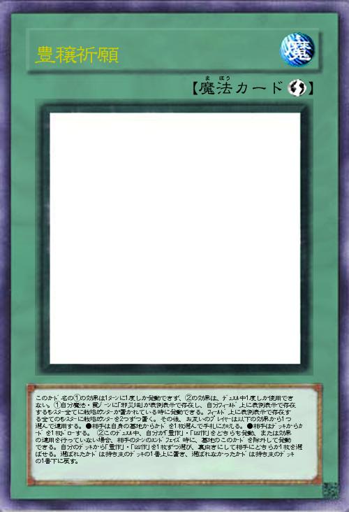 | このカ-ド名の①の効果は1タ-ンに1度しか発動できず、②の効果は、デュエル中1度しか使用できない。①自分魔法・罠ゾ-ンに「邪災畑」が表側表示で存在し、自分フィ-ルド上に表側表示で存在するモンスタ-全てに栽培カウンタ-が置かれている時に発動できる。フィ-ルド上に表側表示で存在する全てのモンスタ-に栽培カウンタ-を2つずつ置く。その後、お互いのプレイヤ-は以下の効果から1つ選んで適用する。●相手は自身の墓地からカ-ドを1枚選んで手札に加える。●相手はデッキからカ-ドを1枚ドロ-する。 ②このデュエル中、自分が「豊作」・「凶作」をどちらも発動、または効果の適用を行っていない場合、相手のタ-ンのエンドフェイズ時に、墓地のこのカ-ドを除外して発動できる。自分のデッキから「豊作」・「凶作」を1枚ずつ選び、裏向きにして相手にどちらか1枚を選ばせる。選ばれたカ-ドは持ち主の | |||