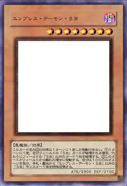 | このカード名の②の効果は1ターンに1度しか発動できない。①1ターンに1度、自分フィールドの「SB」カードが破壊される場合、代わりにフィールドの「SB」以外のカード1枚を破壊する。②このカードがフィールドから離れた場合に発動する。自分は1000のダメージを受け、手札・墓地から「エンプレス・デーモン・SB」以外の「SB」モンスター1体を特殊召喚する。 | |||