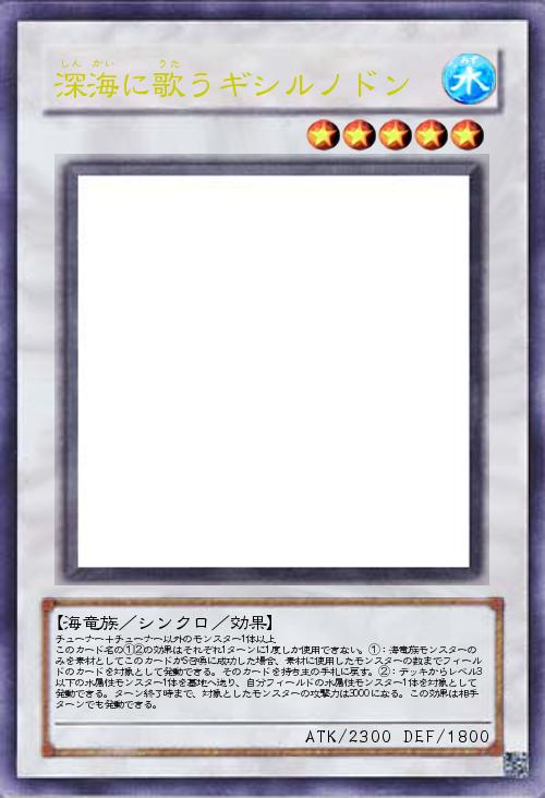 | チューナー+チューナー以外のモンスター1体以上 このカード名の①②の効果はそれぞれ1ターンに1度しか使用できない。①:海竜族モンスターのみを素材としてこのカードがS召喚に成功した場合、素材に使用したモンスターの数までフィールドのカードを対象として発動できる。そのカードを持ち主の手札に戻す。②:デッキからレベル3以下の水属性モンスター1体を墓地へ送り、自分フィールドの水属性モンスター1体を対象として発動できる。ターン終了時まで、対象としたモンスターの攻撃力は3000になる。この効果は相手ターンでも発動できる。 | |||