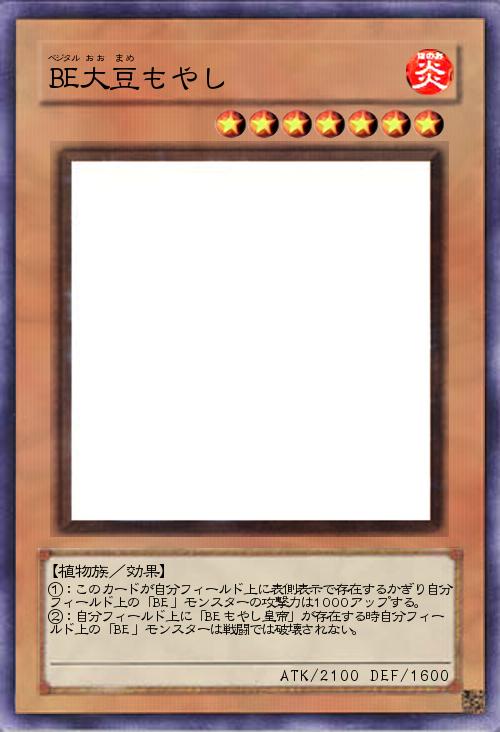 | ①:このカードが自分フィールド上に表側表示で存在するかぎり自分フィールド上の「BE」モンスターの攻撃力は1000アップする。 ②:自分フィールド上に「BEもやし皇帝」が存在する時自分フィールド上の「BE」モンスターは戦闘では破壊されない。 | |||