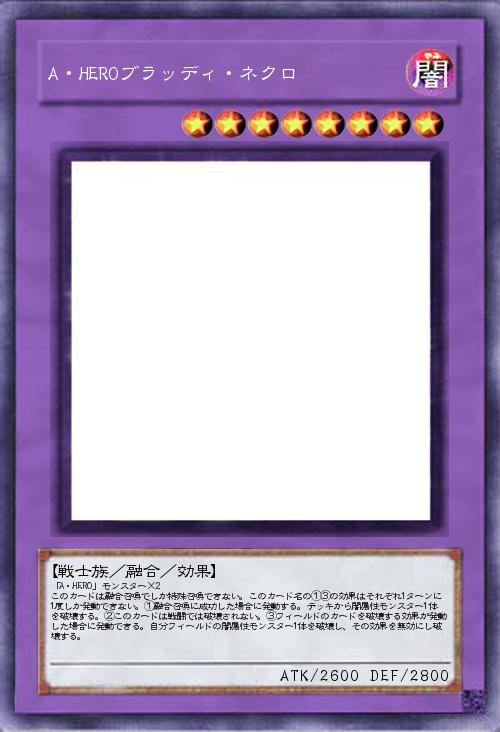 | 「A・HERO」モンスター×2 このカードは融合召喚でしか特殊召喚できない。このカード名の①③の効果はそれぞれ1ターンに1度しか発動できない。①融合召喚に成功した場合に発動する。デッキから闇属性モンスター1体を破壊する。②このカードは戦闘では破壊されない。③フィールドのカードを破壊する効果が発動した場合に発動できる。自分フィールドの闇属性モンスター1体を破壊し、その効果を無効にし破壊する。 | |||