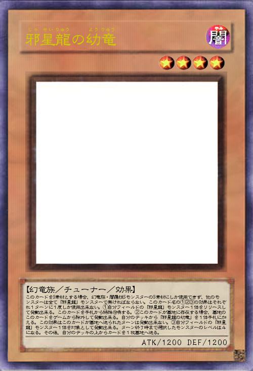 | このカードをS素材とする場合、幻竜族・闇属性SモンスターのS素材にしか使用できず、他のモンスターは全て「邪星龍」モンスターで無ければならない。このカード名の①②③の効果はそれぞれ1ターンに1度しか使用出来ない。①自分フィールドの「邪星龍」モンスター1体をリリースして発動出来る。このカードを手札から特殊召喚する。②このカードが墓地に存在する場合、墓地のこのカードをゲームから除外して発動出来る。自分のデッキから「邪星龍の幼竜」を1体手札に加える。この効果はこのカードが墓地へ送られたターンは発動出来ない。③自分フィールドの「邪星龍」モンスター1体を対象として発動出来る。ターン終了時まで選択したモンスターのレベルは4になる。その後、自分のデッキの上からカードを1枚墓地へ送る。 | |||
