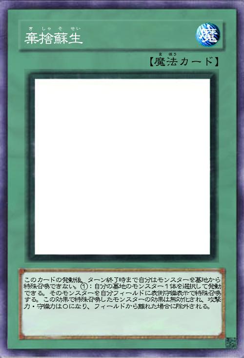 | このカードの発動後、ターン終了時まで自分はモンスターを墓地から特殊召喚できない。①:自分の墓地のモンスター1体を選択して発動できる。そのモンスターを自分フィールドに表側守備表示で特殊召喚する。この効果で特殊召喚したモンスターの効果は無効化され、攻撃力・守備力は0になり、フィールドから離れた場合に除外される。 | |||