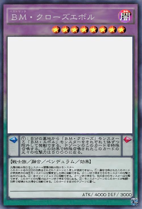| ①:自分の墓地から「BM・クローズ」モンスターと「BM・エボル」モンスターをそれぞれ1体ずつ除外して発動できる。Pゾーンのこのカードを特殊召喚する。この効果で特殊召喚されたこのカードの元々の攻撃力は5000になる。 | |||
