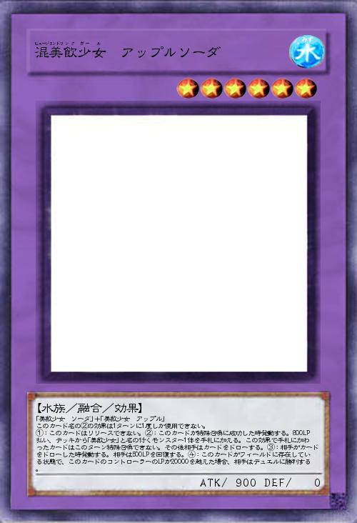 | 「美飲少女 ソーダ」+「美飲少女 アップル」 このカード名の②の効果は1ターンに1度しか使用できない。 ①:このカードはリリースできない。②:このカードが特殊召喚に成功した時発動する。800LP払い、デッキから「美飲少女」と名の付くモンスター1体を手札に加える。この効果で手札に加わったカードはこのターン特殊召喚できない。その後相手はカードをドローする。③:相手がカードをドローした時発動する。相手は500LPを回復する。④:このカードがフィールドに存在している状態で、このカードのコントローラーのLPが20000を越えた場合、相手はデュエルに勝利する。 | |||