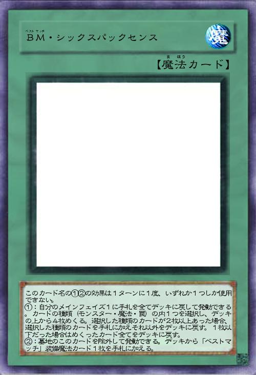 | このカード名の①②の効果は1ターンに1度、いずれか1つしか使用できない。 ①:自分のメインフェイズ1に手札を全てデッキに戻して発動できる。カードの種類(モンスター・魔法・罠)の内1つを選択し、デッキの上から4枚めくる。選択した種類のカードが2枚以上あった場合、選択した種類のカードを手札に加えそれ以外をデッキに戻す。1枚以下だった場合はめくったカード全てをデッキに戻す。 ②:墓地のこのカードを除外して発動できる。デッキから「ベストマッチ」装備魔法カード1枚を手札に加える。 | |||