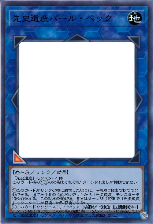 | 「先史遺産」モンスター1体 このカード名の①②の効果はそれぞれ1ターンに1度しか発動できない。 ①このカードがリンク召喚に成功した場合に、手札を2枚まで捨てて発動できる。捨てた手札の枚数だけデッキから「先史遺産」モンスターを特殊召喚する。この効果の発動後、自分はターン終了時まで「先史遺産」モンスターしか召喚・特殊召喚できない。 ②このカードをリリースし、1~12までの数を1つ宣言して発動できる。ターン終了時まで、この効果の発動時に自分フィールドに存在していた「先史遺産」モンスターのレベルは宣言した数値になる。 | |||