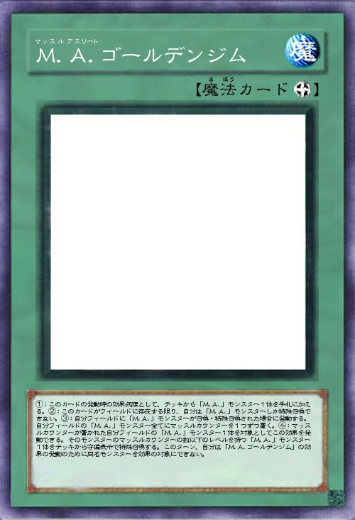 | ①:このカードの発動時の効果処理として、デッキから「M.A.」モンスター1体を手札に加える。②:このカードがフィールドに存在する限り、自分は「M.A.」モンスターしか特殊召喚できない。③:自分フィールドに「M.A.」モンスターが召喚・特殊召喚された場合に発動する。自分フィールドの「M.A.」モンスター全てにマッスルカウンターを1つずつ置く。④:マッスルカウンターが置かれた自分フィールドの「M.A.」モンスター1体を対象としてこの効果を発動できる。そのモンスターのマッスルカウンターの数以下のレベルを持つ「M.A.」モンスター1体をデッキから守備表示で特殊召喚する。このターン、自分は「M.A.ゴールデンジム」の効果の発動のために同名モンスターを効果の対象にできない。 | |||