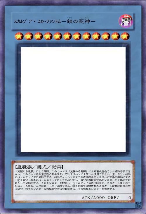 | 「覚醒める悪夢」により降臨。このカードは「覚醒める悪夢」による儀式召喚でしか特殊召喚できない。このカード名の①②③の効果はそれぞれ1ターンに1度しか使用できない。①:自分・相手のバトルフェイズに発動できる。相手フィールドの全ての表側表示モンスターの効果を無効にする。②:自分・相手のバトルステップにLPを半分払い、自分の墓地の効果モンスターを2体まで対象として発動できる。そのモンスターを除外し、バトルフェイズ終了時まで、このカードはそのモンスターと同じ、元々のカード名・効果を得る。③:戦闘で破壊されたこのカードが墓地に存在する場合、相手モンスターの攻撃宣言時に発動できる。その攻撃モンスターを破壊する。 | |||