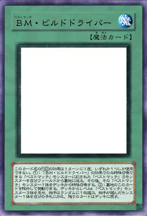 | このカード名の①②の効果は1ターンに1度、いずれか1つしか使用できない。①:「BM・ビルドドライバー」の効果でのみ特殊召喚できる「ベストマッチ」モンスターに記された「ベストマッチ」Sモンスターを自分フィールドから墓地に送る。その後、その「ベストマッチ」モンスター1体をデッキから特殊召喚する。②:墓地のこのカードを除外して発動できる。デッキからレベル4「ベストマッチ」モンスター3体を見せ、相手はランダムに1枚選ぶ。相手が選んだモンスター1体を自分の手札に加え、残りのカードはデッキに戻す。 | |||