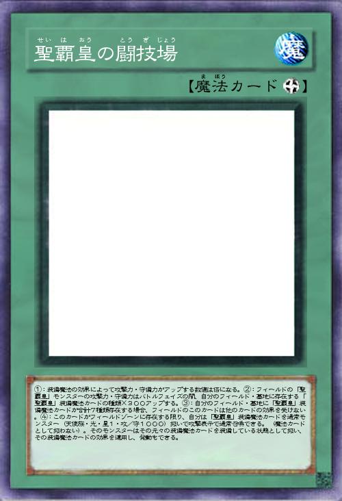 | ①:装備魔法の効果によって攻撃力・守備力がアップする数値は倍になる。②:フィールドの「聖覇皇」モンスターの攻撃力・守備力はバトルフェイズの間、自分のフィールド・墓地に存在する「聖覇皇」装備魔法カードの種類×300アップする。③:自分のフィールド・墓地に「聖覇皇」装備魔法カードが合計7種類存在する場合、フィールドのこのカードは他のカードの効果を受けない。④:このカードがフィールドゾーンに存在する限り、自分は「聖覇皇」装備魔法カードを通常モンスター(天使族・光・星1・攻/守1000)扱いで攻撃表示で通常召喚できる。(魔法カードとして扱わない)。そのモンスターはその元々の装備魔法カードを装備している状態として扱い、その装備魔法カードの効果を適用し、発動もできる。 | |||