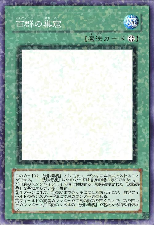 | このカードは「洗脳奇蟲」として扱い、デッキに4枚以上入れることができる。 「洗脳奇蟲」以外のカードは自身の場に存在できない。 ①自身のスタンバイフェイズ時に発動する。戦闘破壊された「洗脳寄蟲」を墓地からデッキに戻す。 ②1ターンに1度、①の効果でデッキに戻した数と同じ分、自分フィールドのモンスター一体に変異カウンターをのせる。 ③フィールドの変異カウンターを任意の数取り除くことで、取り除いたカウンターと同じ数のレベルの「洗脳奇蟲」を墓地から特殊召喚する。 | |||