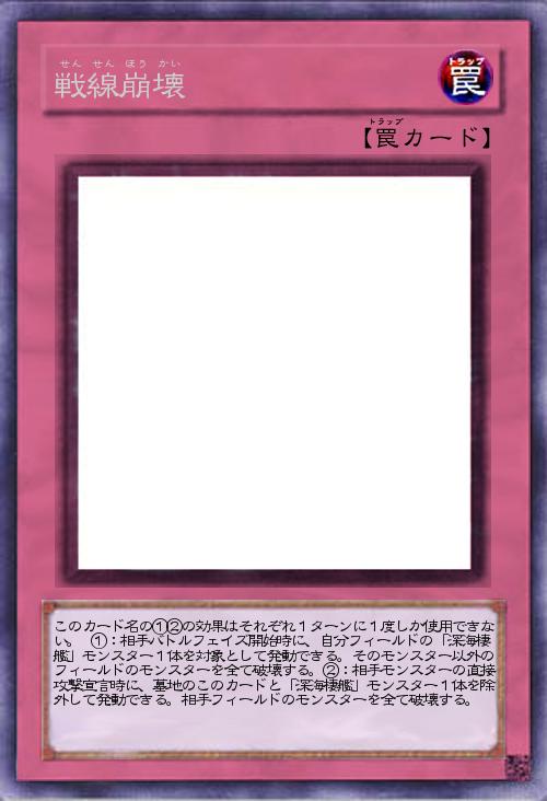 | このカード名の①②の効果はそれぞれ1ターンに1度しか使用できない。 ①:相手バトルフェイズ開始時に、自分フィールドの「深海棲艦」モンスター1体を対象として発動できる。そのモンスター以外のフィールドのモンスターを全て破壊する。②:相手モンスターの直接攻撃宣言時に、墓地のこのカードと「深海棲艦」モンスター1体を除外して発動できる。相手フィールドのモンスターを全て破壊する。 | |||