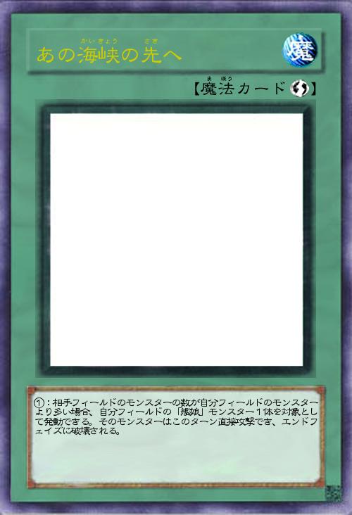 | ①:相手フィールドのモンスターの数が自分フィールドのモンスターより多い場合、自分フィールドの「艦娘」モンスター1体を対象として発動できる。そのモンスターはこのターン直接攻撃でき、エンドフェイズに破壊される。 | |||