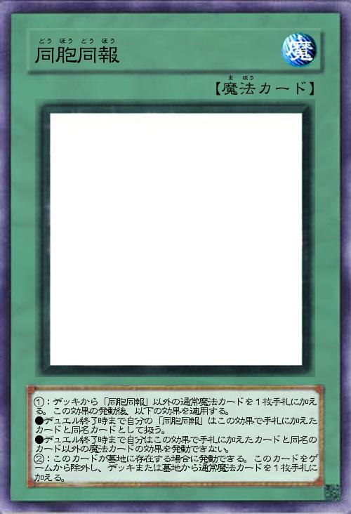 | ①:デッキから「同胞同報」以外の通常魔法カードを1枚手札に加える。この効果の発動後、以下の効果を適用する。 ●デュエル終了時まで自分の「同胞同報」はこの効果で手札に加えたカードと同名カードとして扱う。 ●デュエル終了時まで自分はこの効果で手札に加えたカードと同名のカード以外の魔法カードの効果を発動できない。 ②:このカードが墓地に存在する場合に発動できる。このカードをゲームから除外し、デッキまたは墓地から通常魔法カードを1枚手札に加える。 | |||