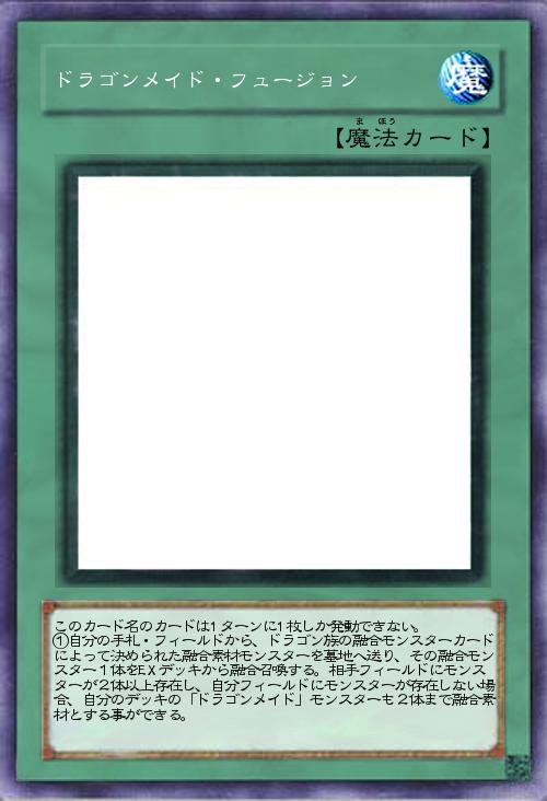 | このカード名のカードは1ターンに1枚しか発動できない。 ①自分の手札・フィールドから、ドラゴン族の融合モンスターカードによって決められた融合素材モンスターを墓地へ送り、その融合モンスター1体をEXデッキから融合召喚する。相手フィールドにモンスターが2体以上存在し、自分フィールドにモンスターが存在しない場合、自分のデッキの「ドラゴンメイド」モンスターも2体まで融合素材とする事ができる。 | |||