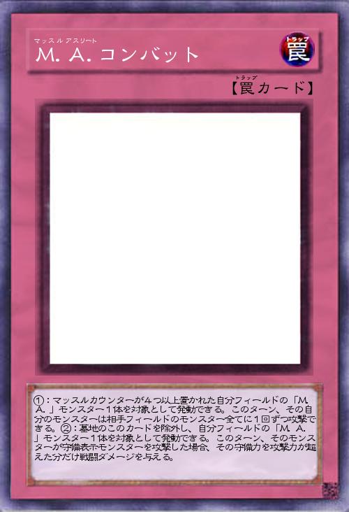 | ①:マッスルカウンターが4つ以上置かれた自分フィールドの「M.A.」モンスター1体を対象として発動できる。このターン、その自分のモンスターは相手フィールドのモンスター全てに1回ずつ攻撃できる。②:墓地のこのカードを除外し、自分フィールドの「M.A.」モンスター1体を対象として発動できる。このターン、そのモンスターが守備表示モンスターを攻撃した場合、その守備力を攻撃力が超えた分だけ戦闘ダメージを与える。 | |||