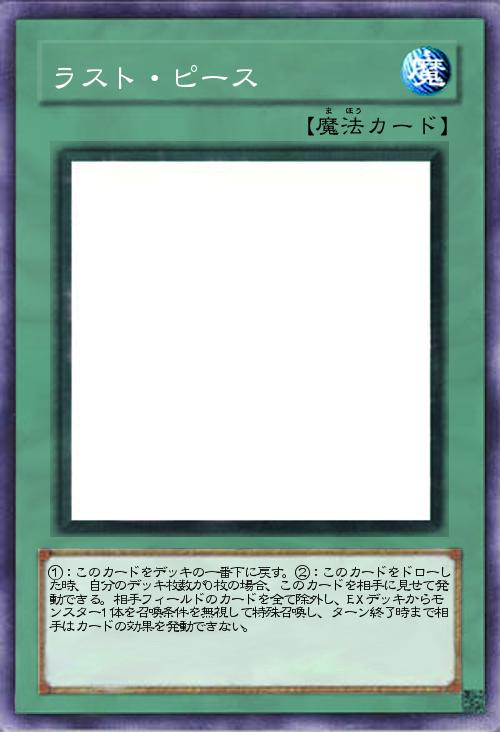| ①:このカードをデッキの一番下に戻す。②:このカードをドローした時、自分のデッキ枚数が0枚の場合、このカードを相手に見せて発動できる。相手フィールドのカードを全て除外し、EXデッキからモンスター1体を召喚条件を無視して特殊召喚し、ターン終了時まで相手はカードの効果を発動できない。 | |||