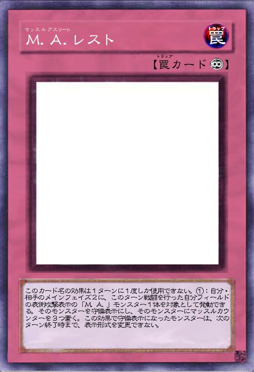 | このカード名の効果は1ターンに1度しか使用できない。①:自分・相手のメインフェイズ2に、このターン戦闘を行った自分フィールドの表側攻撃表示の「M.A.」モンスター1体を対象として発動できる。そのモンスターを守備表示にし、そのモンスターにマッスルカウンターを3つ置く。この効果で守備表示になったモンスターは、次のターン終了時まで、表示形式を変更できない。 | |||