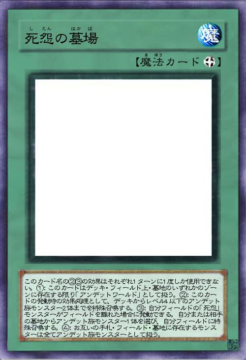 | このカード名の②③の効果はそれぞれ1ターンに1度しか使用できない。①:このカードはデッキ・フィールド上・墓地のいずれかのゾーンに存在する限り「アンデットワールド」として扱う。②:このカードの発動時の効果処理として、デッキからレベル4以下のアンデット族モンスター2体までを特殊召喚する。③:自分フィールドの「死怨」モンスターがフィールドを離れた場合に発動できる。自分または相手の墓地からアンデット族モンスター1体を選び、自分フィールドに特殊召喚する。④:お互いの手札・フィールド・墓地に存在するモンスターは全てアンデット族モンスターとして扱う。 | |||